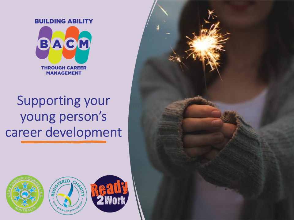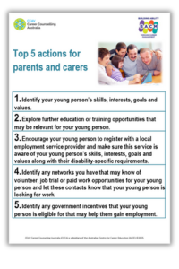 This pack was designed to support parents and carers explore careers and the world of work. The information in this pack can be used to support parent information sessions or directly by parents themselves in improving their role as career development allies in the career journey of young people with disability. A range of resources have been developed to support young people in their personal career planning and management.
